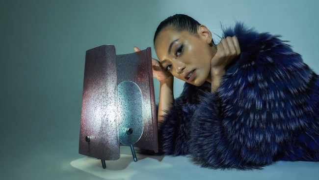 Produk desain kreatif itu handmade dan dibuat dengan adanya kesadaran lingkungan. Desain lampu karya kolaborasi Asmara Abigail dan Adin Ibrahim ini terbuat dari limbah serbuk gergaji dengan memadukan garis-garis post-modernisme Italia dengan palet warna-warni bernuansa ungu lembut yang mencerminkan feminitas dipadukan dengan eskpresi penuh gairah.