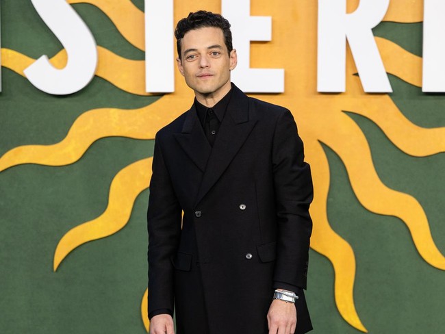 Rami Malek mengenakan topi baseball biru, sweater hitam, dan celana denim. Sementara itu, Emma Corrin mengenakan coat taupe dan potongan rambut cepak terbarunya.