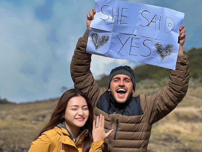 Foto itu menampilkan diri Nathalie Holscher dan Ladislao Camra di Gunung Gede, Jawa Barat. Keduanya tampak sangat romantis berbagi momen lamaran itu.