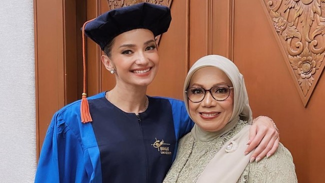 Meski sang suami berada di Amerika Serikat, momen wisuda Enzy Storia ditemani para sahabat seperti Hesti Purwadinata dan Medina. Tidak ketinggalan, Enzy Storia juga didampingi oleh sang bunda.