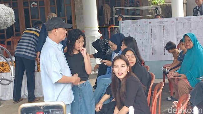Tak sendiri Ayu Ting Ting juga mengajak ayahnya, Abdul Rozak dan ibundanya Umi Kalsum hingga adiknya Syifa. Ia terpantau keluar rumah sekitar pukul 09.59 WIB menuju TPS yang hanya 50 meter dari kediamannya.