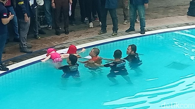 Polisi melakukan rekonstruksi soal tewasnya putra Tamara Tyasmara, Dante, yang ditenggelamkan oleh Yudha Arfandi di Kolam Renang Taman Air Tirtamas, Pondok Kelapa, Jakarta Timur.