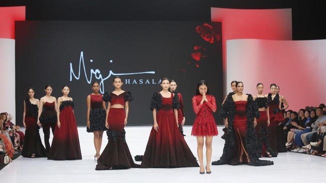 Dalam kesempatan itu, Migi Rihasalay membawakan koleksi terbarunya dengan tema Mawar Hitam yang didominasi warna gradasi merah maroon dan hitam.
