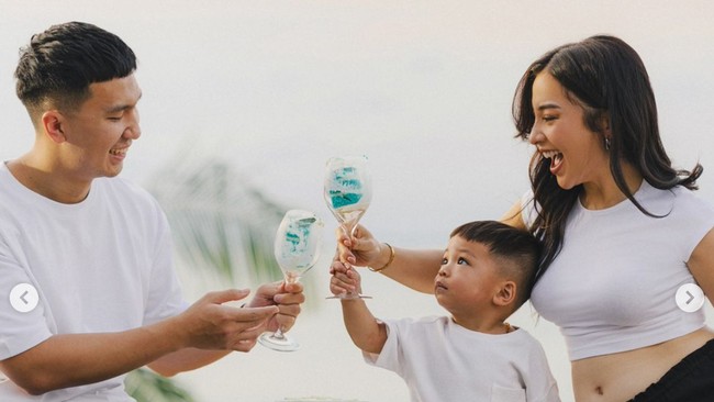 Deretan foto dengan senyum bahagia dibagikan Nikita Willy dan Indra Priawan. Aktris berusia 29 tahun itu terlihat memakai kaus putih dengan memperlihatkan bagian perutnya sambil menggendong putra pertamanya, Issa.