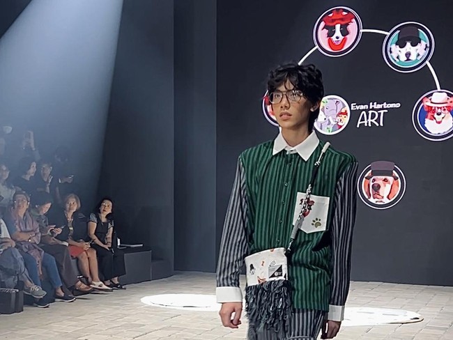 Devon melangkah penuh percaya diri, memperagakan karya desainer Adrie Basuki x Evan Hartono bertema Art Collaboration PURE Unconditional Love. Kapsul PURE (Unconditional Love) karya Adrie Basuki menampilkan ilustrasi unik dari Evan Hartono pada berbagai model streetwear dengan konsep modular fashion, atau bisa dipakai lebih dari satu gaya.