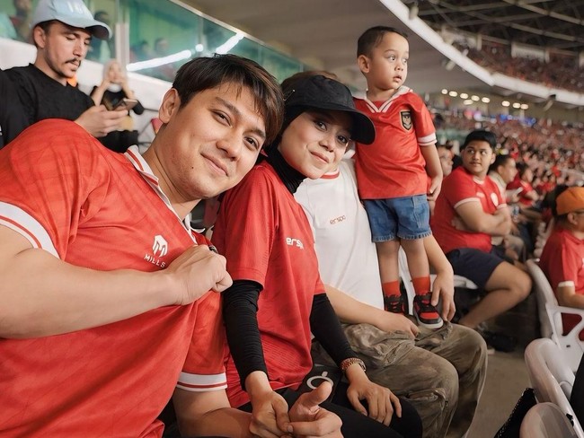 Wah... Abang L nonton langsung laga Timnas Indonesia vs Australia bareng orang tuanya, Lesti Kejora dan Rizky Billar di GBK nih semalam. Foto: dok. Instagram Rizky Billar