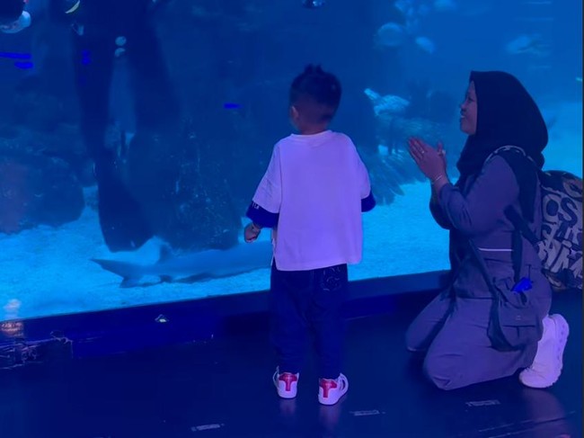 Rayyanza yang diajak di salah satu akuarium tersebut langsung tersipu malu. Ia pun terlihat senang dan loncat-loncat saat melihat banyak ikan di sana.