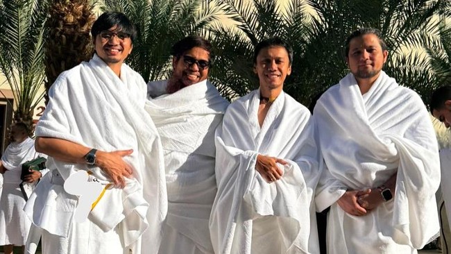 Duta, Sakti, Eross, dan Adam tersenyum saat mereka memekai ihram di Makkah. Sakti kembali menuliskan kalimat indah dalam unggahannya. Sakti berujar kalimat itu dibuat oleh Eross.