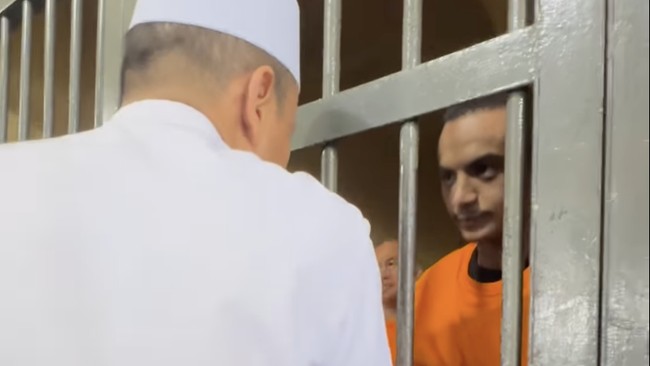 Vadel Badjideh yang kini botak tersenyum dan mencium tangan Ustaz Das'ad Latif dari balik jeruji besi. Ustaz Das'ad Latif terlihat menanyakan kabar Vadel Badjideh.