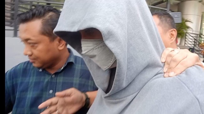 Pertama kalinya terlihat usai ditangkap, bintang film Pengabdi Setan itu memakai hoodie abu-abu. Sebagian besar wajahnya juga ditutupi oleh masker. Dia terus tertunduk sepanjang jalan.