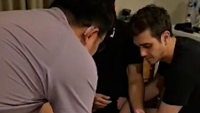 Bintang film Siksa Kubur itu terlihat memakai celana pendek dan kaus hitam. Terlihat sekitar empat anggota kepolisian tanpa seragam membuka sebuah tas berwarna gelap.