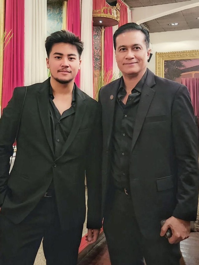 Ayah dan anak ini sama-sama mengenakan setelan jas serba hitam. Rafi yang sudah berusia 26 tahun tingginya hampir sama dengan Adjie Pangestu. (Foto: dok Instagram)