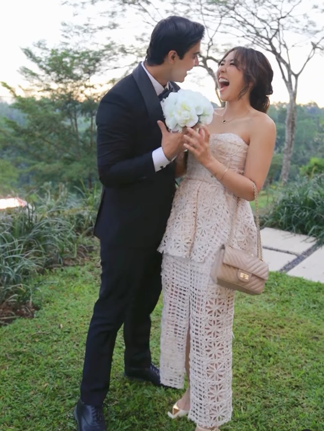 Gisella Anastasia dan Cinta Brian jadi pasangan pertama yang menerima lemparan buket bunga dari Luna Maya dan Maxime Bouttier. Duh... tawa Gisel dan Cinta Brian semringah banget. Foto: dok. Instagram Luna Maya