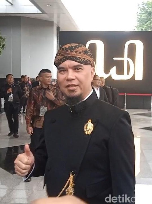 Jakarta - Ahmad Dhani dan Mulan Jameela sudah tiba di lokasi unduh mantu Al Ghazali dan Alyssa Daguise. Dhani memakai beskap dan Mulan berkebaya dengan warna fuchsia.