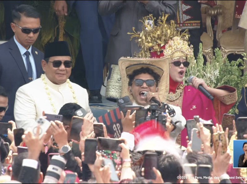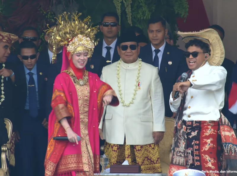 Diva Aurel memakai suntiang gak membuatnya terhalang nyanyi Tabola Bale dengan energik di Upacara HUT ke-80 RI di Istana Merdeka, Minggu (17/8/2025). Foto: Channel YouTube Sekretariat Presiden