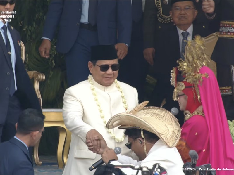 Momen Prabowo Subianto itu disambut meriah oleh tamu undangan yang sudah memenuhi area depan di bawah mimbar kehormatan. Foto: Channel YouTube Sekretariat Presiden