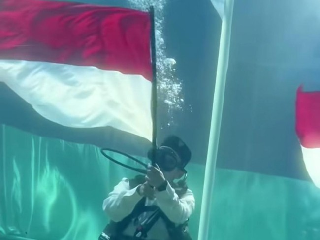 Dengan penuh rasa bangga, ayah tiga anak itu, mengibarkan Sang Saka Merah Putih di dalam akuarium besar yang dipenuhi berbagai biota laut, termasuk hiu yang berjumlah 18 ekor.