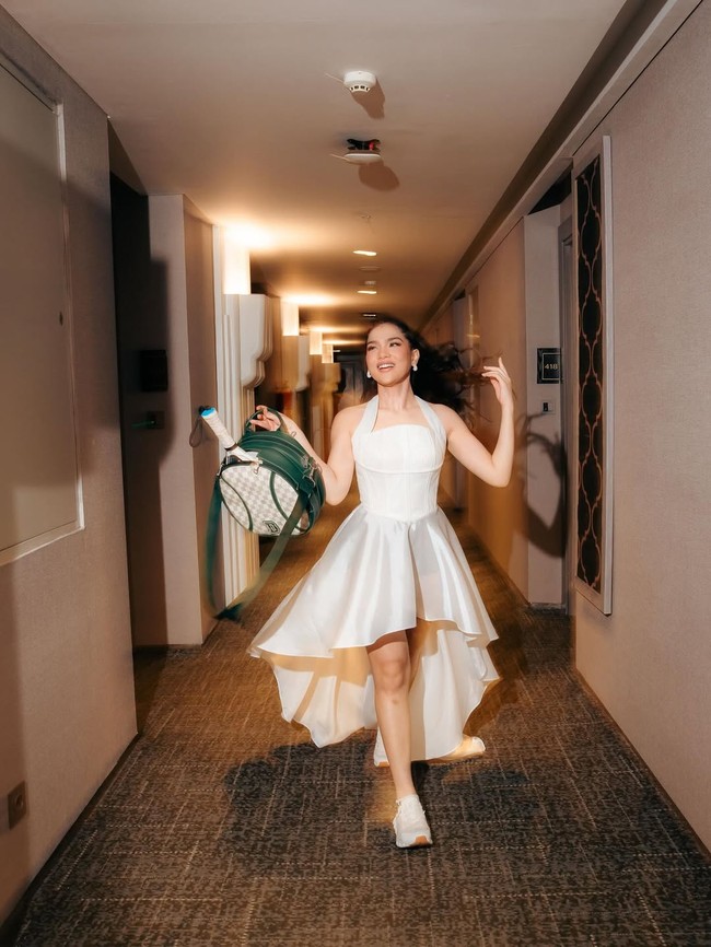 Davina Karamoy bergaya sporty di pesta ulang tahun ke-23. Lihat tuh pakai gaun, tapi bawahannya sepatu padel yang pas banget sambil tenteng raketnya. (Foto: dok Instagram davinaakaramoy)