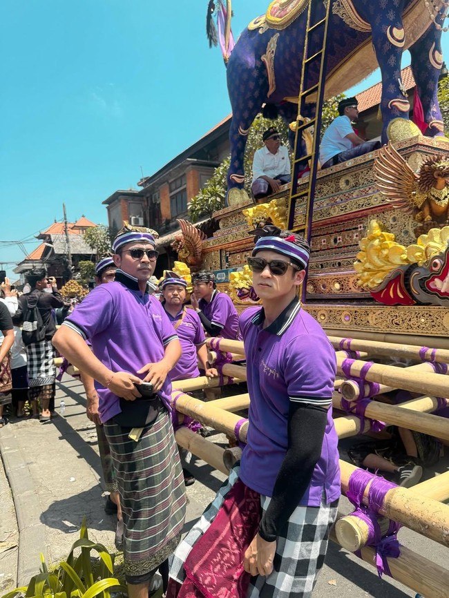 Antonio Blanco Junior mengunggah foto-foto saat dirinya turut dalam upacara pelebon untuk mendiang Cokorda Niti Yadnya. Antonio memakai polo berwarna ungu sama seperti dengan pengangkat lembu raksasa lainnya, serta udeng dan kamen. Foto: Instagram @antonioblancojr