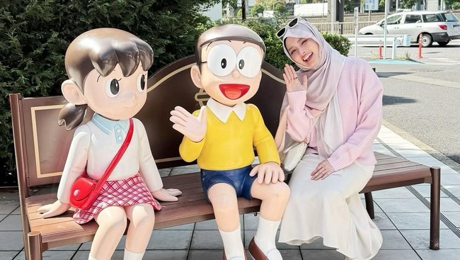 Inara Rusli bahagia bisa ke tempat patung Doraemon di Jepang. Di sini ia berpose kayak Nobita lagi say hai. (Foto: dok Instagram mommy_starla)
