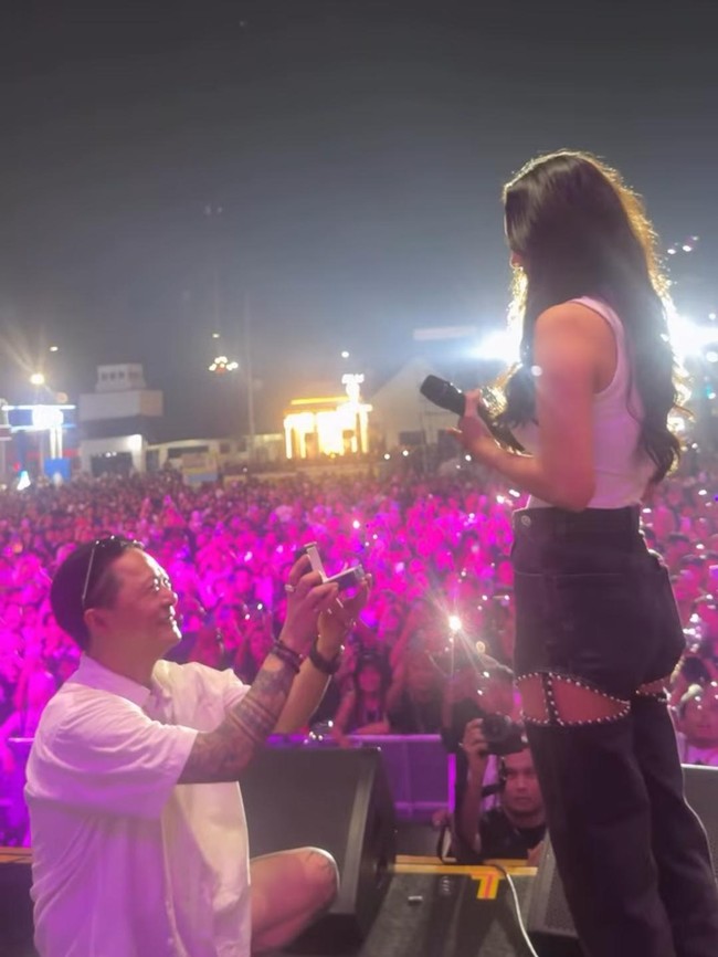 DJ Bravy melamar Erika Carlina di tengah penampilannya bersama AAA Clan di Synchronize Fest 2025. Reza Arap meminta Erika naik ke panggung. Foto: Instagram @bravyson.vconk / @rachelvennya