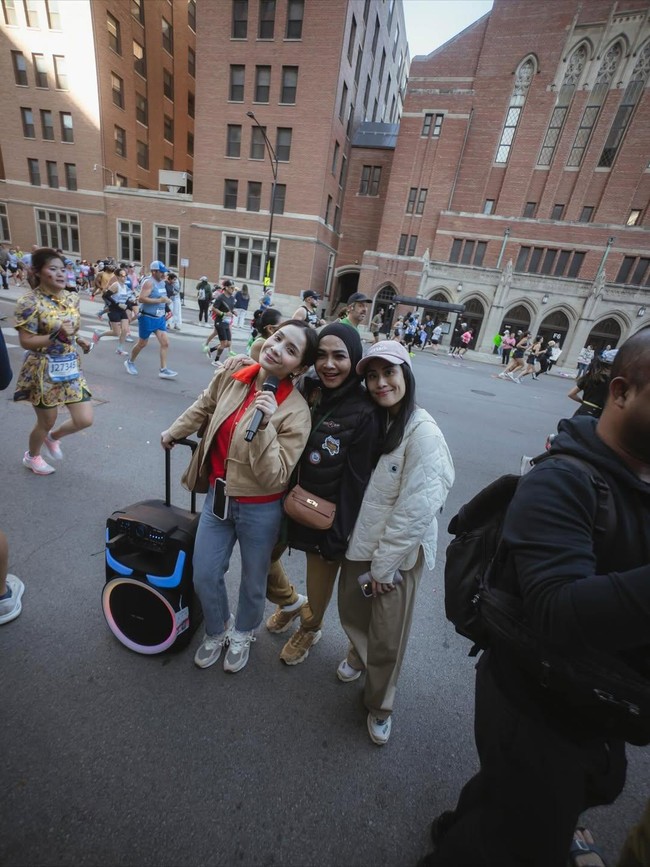 Nagita Slavina, Rieta Amilia, dan Gya P sadiqah mendukung suami dan menantu mereka ikut Chicago Marathon 2025 pada Minggu (12/10/2025) waktu setempat. Foto: Instagram @raffinagita1717