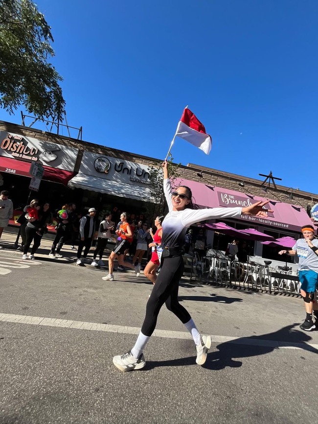 Ririn Ekawati excited banget mengikuti Chicago Marathon, Minggu (12/10/2025). Ririn membawa bendera Merah Putih. Foto: Instagram @ririnekawati