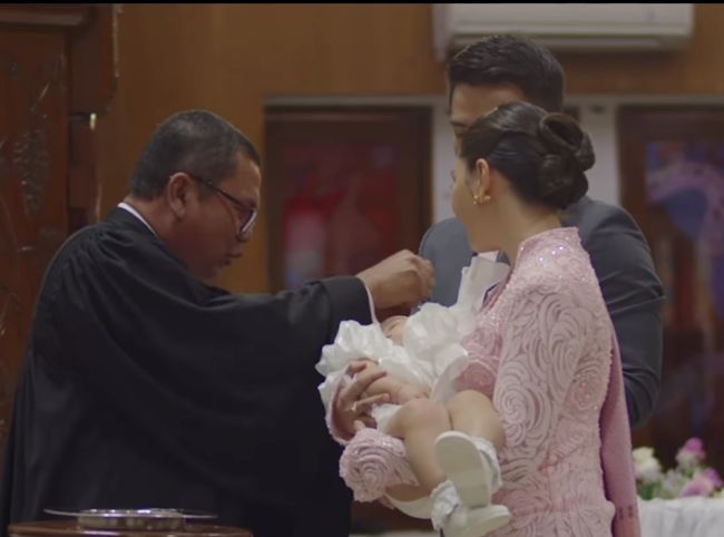 Jessica Mila dan Yakup Hasibuan mendampingi putrinya, Kyarra Arunika Hasibuan, dibaptis di salah satu gereja di kawasan Rawamangun, Jakarta Timur. Foto: Instagram @jscmila