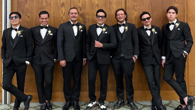 Gaya para pesohor groomsmen pernikahan Boiyen dengan memakai jas dan celana panjang hitam. (Foto: dok Instagram andreastaulany)