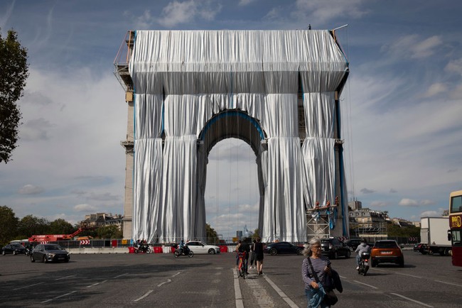 Jakarta - Monumen ikonik Arc De Triomphe di Prancis kini tampak berbeda. Intip foto-foto penampakan terkini dari Arc De Triomphe yang berselimut kain panjang.
