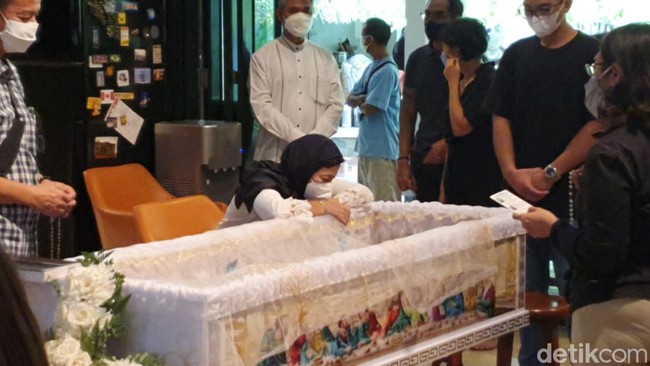 Jakarta - Jenazah putri Nurul Arifin sudah disemayamkan di rumah duka di kawasan Puri Cinere, Depok, Jawa Barat. Nurul Arifin tampak tegar duduk di samping peti jenazah putrinya tersebut.