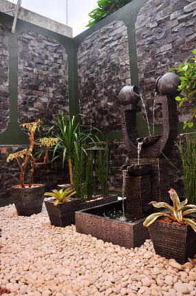 "Tadinya taman depan dan belakang itu kosong. Nggak ada apa-apa, tapi alhamdulillah satu per satu saya tata dari air mancurnya sampai batu-batuannya. Dan sekarang kelihatan lebih hijau," katanya.