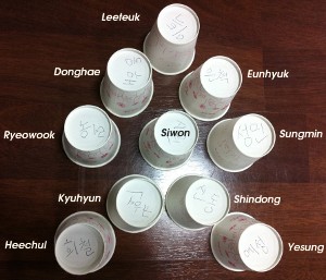 Tampak hanya ada 10 gelas kertas yang bernama 10 anggota Super Junior. Jadi, masih mungkinkah Super Junior kembali tampil dengan formasi lengkap?