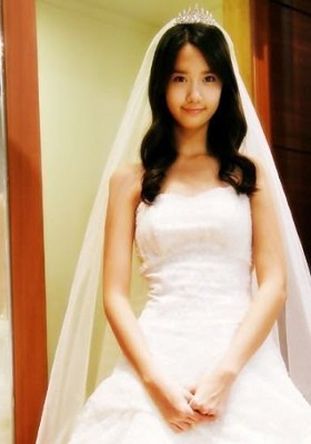 Personel SNSD Yoona tampil manis dengan gaun pengantin sederhana. Rambutnya ditata tak berlebihan dengan mahkota dan veil panjang.