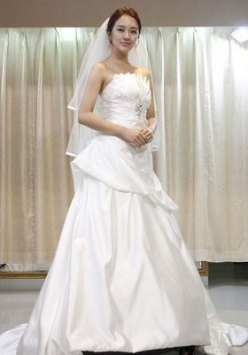 Aktris cantik Yoon Eun Hye tampak seperti pengantin sebenarnya dengan gaun ini. Ia pun berpose anggun dengan rambut digelung rapi ke belakang.