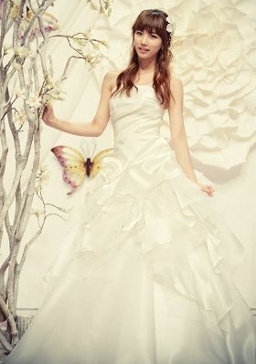 Di usianya yang ke-18 tahun personel miss A Suzy pernah pula mengenakan gaun pengantin. Warna broken white itu tampak cocok dengan rambut Suzy yang kecoklatan.