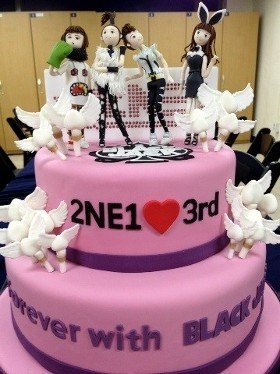 Dengan mudah kamu pasti bisa menebak siapa yang mana di kue ini. Sandara bahkan mengenakan rompi bulu dan rambutnya dikuncir ke atas. Ini adalah kue untuk merayakan 3 tahun debut 2NE1.