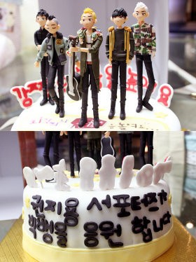 Bigbang pun pernah mendapat kue serupa. Detailnya tak kalan sempurna. Bahkan hingga fringe di bahu Daesung pun dibuat sama persis. Juga motif loreng di jaket TOP. Sesuai kostumnya, kue ini dibuat untuk merayakan promo lagu 'Tonight'.