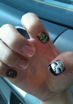 Jika yang sebelumnya tengkoraknya timbul, yang satu ini tidak. Gambar tengkorak berwarna-warni itu hanya dilukis Hongki di kukunya.