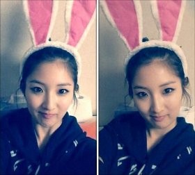 Hyosung 'SECRET'dikenal dengan image-nya yang selalu tampil imut. Ia mengenakan baju bermotif stripes yang senada dengan telinga kelinci pink-nya.