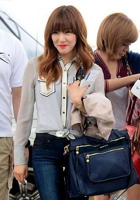 Ke bandara pun Tiffany tak lupa berdandan cantik. Dengan setelan baju yang cenderung monokrom putih biru, bibir Tiffany berwarna merah menyala.