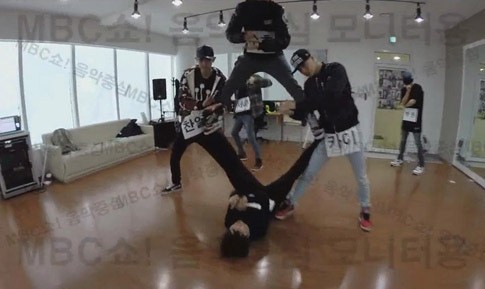 D.O tampak berbaring dengan kaki terbuka lebar dan diangkat ke atas. Chanyeol dan Kai berdiri masing-masing di sebelah kiri dan kanan kaki D.O, sambil menopang Suho yang berada di atas telapak kaki D.O.