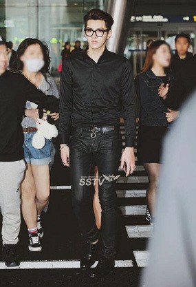 Tampak belt melingkar di pinggang Kris, kacamata bertengger di atas hidungnya dan sepatu hitam melengkapi penampilannya di Bandara Incheon hari ini. Gelang silver menjadi pemanis di pergelangan tangan kanan Kris.