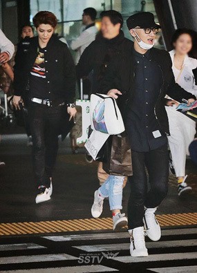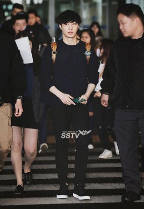 Luhan terlihat menggunakan eyeliner dan riasan smokey eye pagi ini. Kemeja dan celana panjang hitam dipilihnya untuk airport fashion, namun sepatunya terlihat cukup kontras karena berwarna putih.