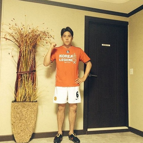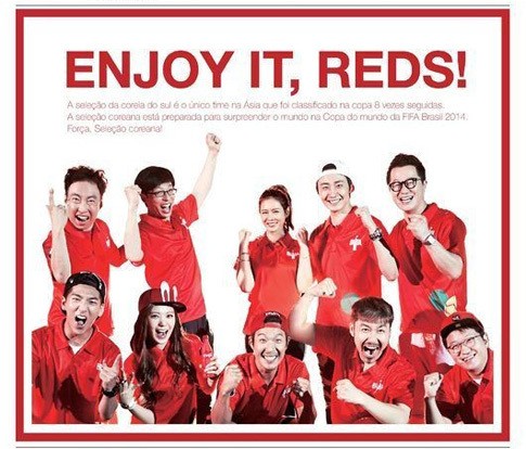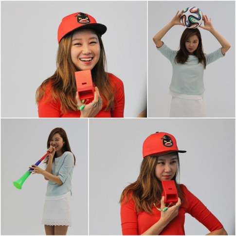 Tampak bersama para member 'Infinity Challenge' aktris Son Ye Jin, Jung Il Woo, Baro 'B1A4', Lizzy 'After School' dan Ji Sang Ryul. Tertulis juga di bagian atas foto, βEnjoy it, Reds! South Korea, which is the only Asian country to play in the World Cup eight times in a row! We are prepared to shock the whole world at this Brazil World Cup. Go go! South Korea!β