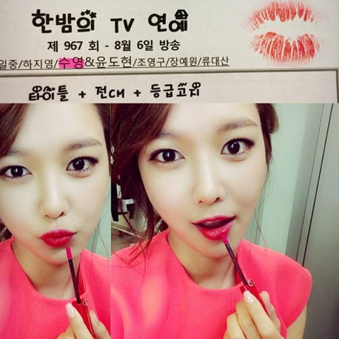"Menyemangati diri di hari yang hujan dengan warna merah!" tulisnya. Sooyoung terlihat cantik dengan gaya sedang mewarnai merah bibirnya. Baju warna pink kemerahan juga dikenakan pelantun 'The Boys' itu.