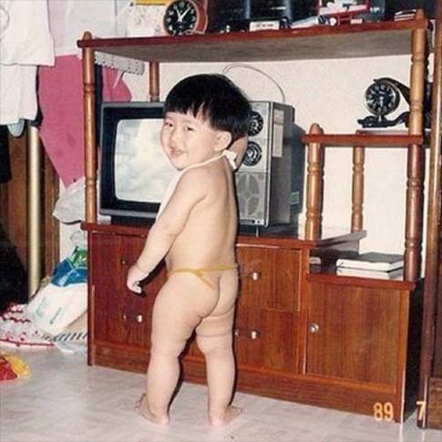 Tampak dalam foto tersebut ia sedang berdiri di depan sebuah rak televisi. Dipotret dari belakang, Kwanghee balita tampak tak mengenakan pakaian. Sebuah celemek putih terpasang di lehernya.