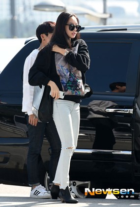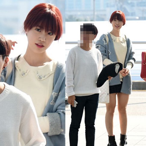Youngji terlihat mengenakan sweater putih dan jaket berwarna biru muda. Seolah cuek dengan cuana dingin, Youngji hanya mengenakan celana superpendek di Bandara pagi ini.