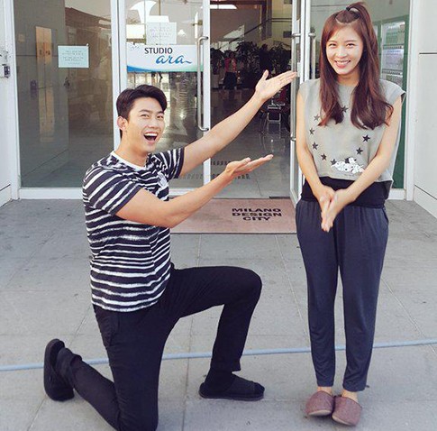 Dalam foto tersebut sang artis JYP Entertainment tampak bahagia, berpose berlutut dengan tangan terangkat ke sosok Ha Ji Won. Sementara sang aktris terlihat malu-malu tersenyum ke arah kamera.