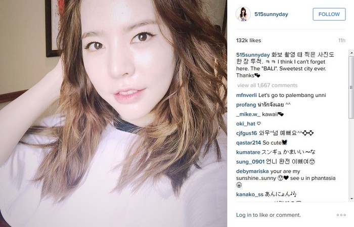 Sebelum kembali ke Korea hari ini, Minggu (10/4/2016), Sunny mengunggah foto selfie di Instagram. Dalam foto yang diambil di tengah-tengah pemotretan itu ia tampak mengenakan busana berwarna putih. Rambutnya terlihat lebih panjang dan bergelombang.